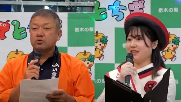 栃木県梨消費宣伝事業委員会 鈴木俊介委員長と栃木フレッシュメイト 山口さん