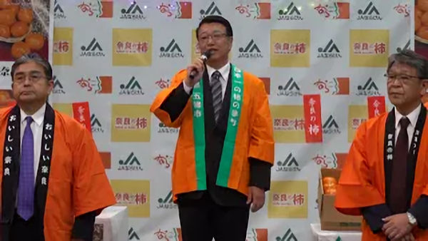 11月14日(木)、東京青果卸売場イベント会場において、奈良県『奈良の柿』のトップセールスが開催されました。奈良県 福谷副知事・五條市 平岡市長・JAならけん 村本会長・奈良の柿PRレディをはじめ行政・産地代表の皆様が来場され,本日初荷を迎えました『富有柿』を大田市場関係者にアピールされました。