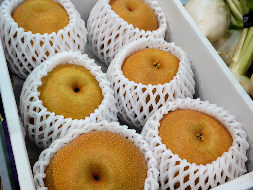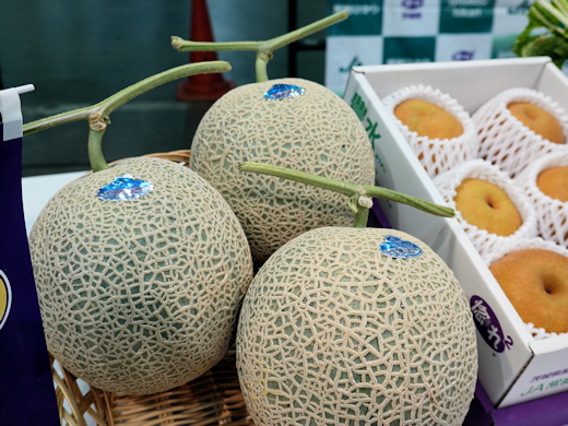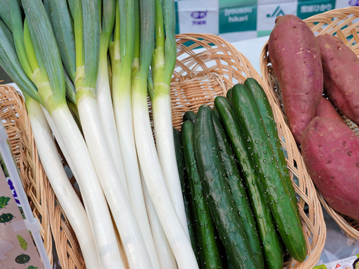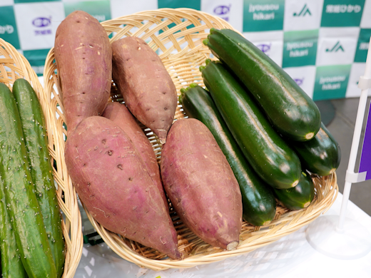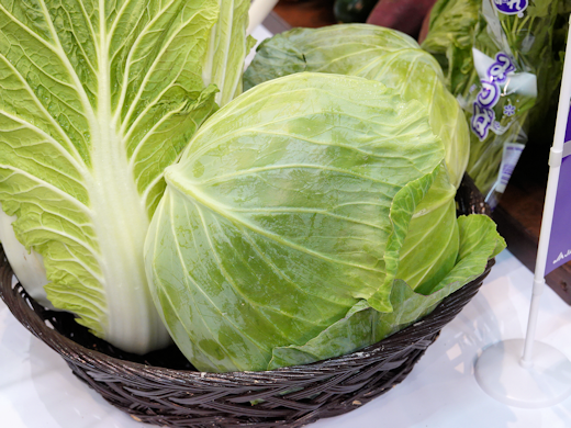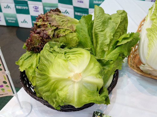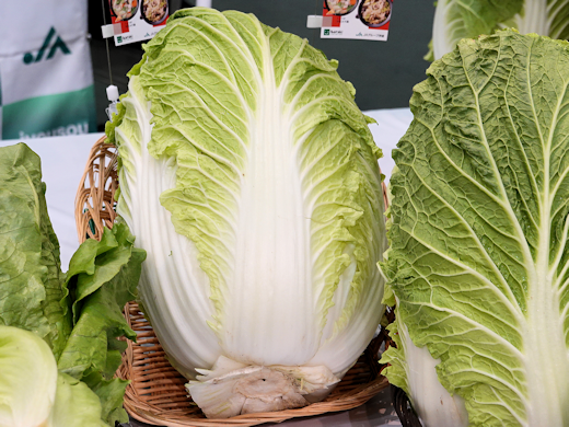 白菜・キャベツ・レタスをはじめ、たくさんの種類の野菜と梨・アールスメロンなどの果物がイベント会場に展示されていました。