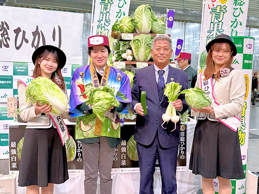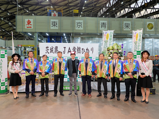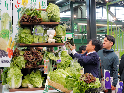 会場にはJA常総ひかり 堤代表理事組合長と猪瀬園芸部連絡協議会会長をはじめ、PR大使・産地代表の皆様が来場され、これから本格出荷を迎える白菜を中心とした『秋冬品目』を市場関係者へアピールされました。