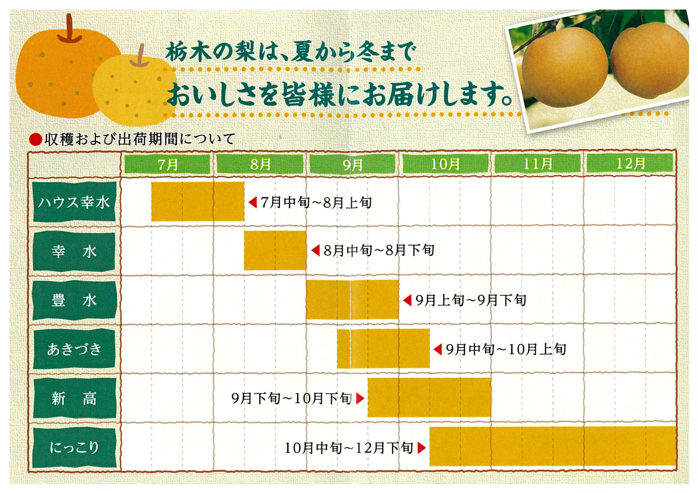栃木県産梨は旧盆明けに「幸水」がピークを迎え、「豊水」「あきづき」「新高」「にっこり」と出荷が続きます。ハウスから貯蔵品まで、品種リレーしながらロングランで『とちぎの梨』が出回ります。