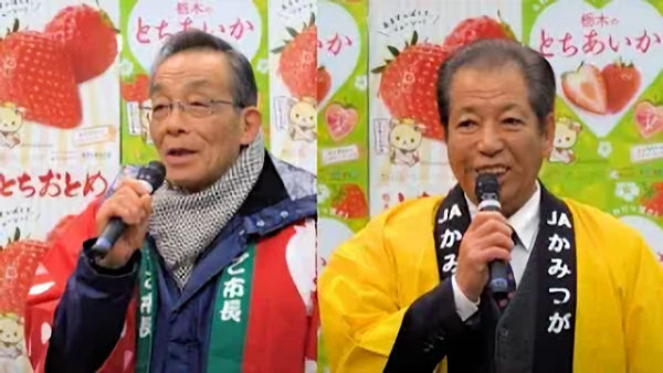 写真左より、鹿沼市 佐藤市長、JAかみつが 大岡いちご部長、