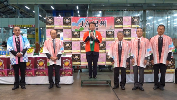 10月11日(金)東京青果卸売場イベント会場において、和歌山県 JA紀州 極早生みかん『ゆら早生』トップセールスが行われました。会場には『ゆら早生』発祥の地である由良町 山名町長、JA紀州 芝代表理事組合長をはじめ産地代表の皆様が来場され『ゆら早生』を市場関係者へアピールしました。