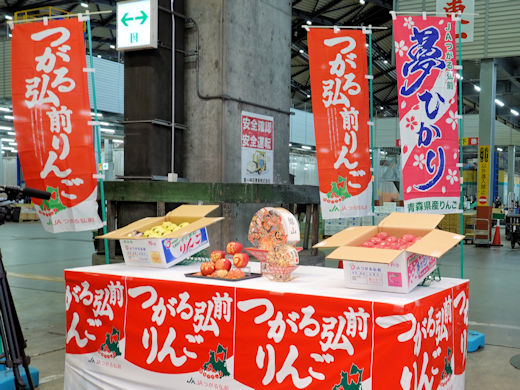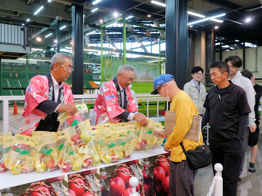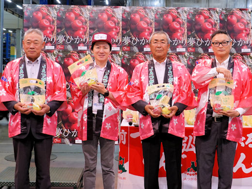 10月3日(金)東京青果卸売場において、青森県JAつがる弘前『夢ひかり』の初荷トップセールスが行われ、展示に加えて、初荷の競売が盛大に行われました。