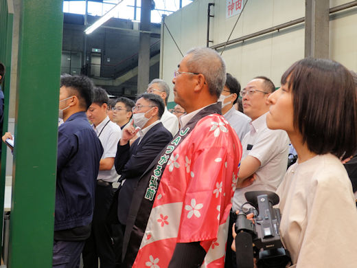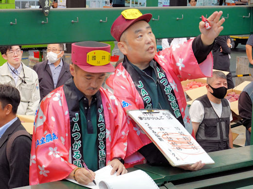 産地関係者が見守る中、JAつがる弘前の皆様とお揃いの「青森りんご」と記された法被を着用した、果実第1事業部の小山による競売がスタートしました。市場関係者からは、次々と手ヤリが上がり、活気に満ちた雰囲気となりました。