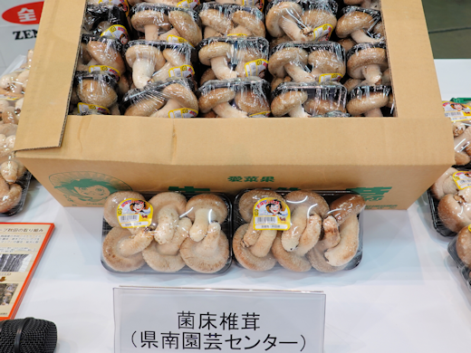 展示された『しいたけ』の説明をする担当部の佐々木部長。川田社長も肉厚な『しいたけ』を見て感心した様子で見入っていました。