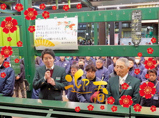 2026年1月5日、本年も多くのお客様とともに初市を迎えることができました。産地からは華やかな宝船やさくらんぼが届けられ、場内は新春の彩りに包まれています。競売場では弊社の川田社長が新年のご挨拶を行いました。