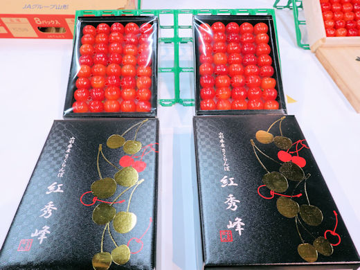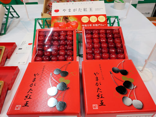 「佐藤錦」「紅秀峰」に加え、期待の品種「やまがた紅王」も競売に。ほかにも様々な商品形態が並びました。
