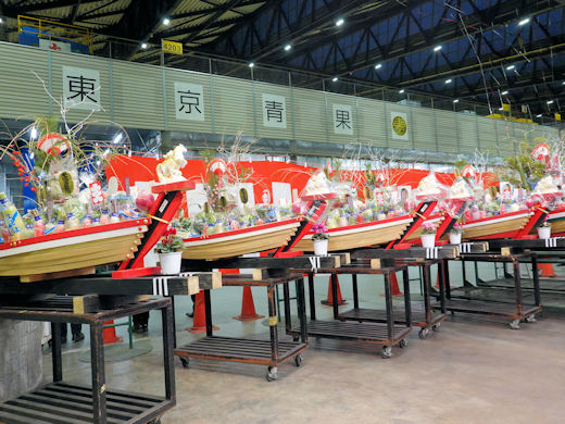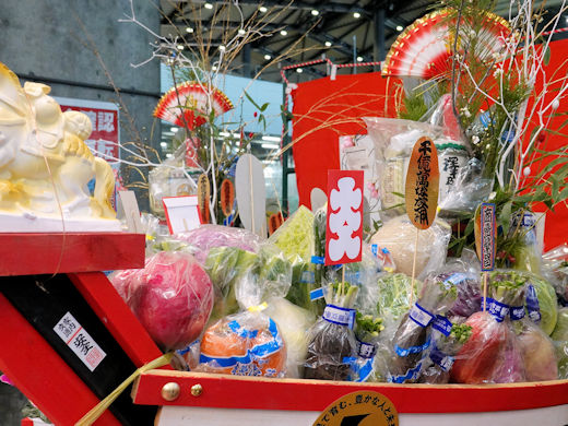 宝船は特大2隻と大5隻。場内では思い思いに談笑したり写真を撮ったりと、新年の穏やかな時間が訪れます。色鮮やかな多くの野菜を積んだ宝船が、新しい一年の幕開けとともに力強く旅立ちます。