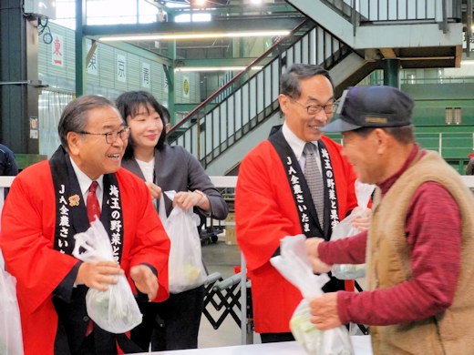 イベント終了後、大野知事と坂本会長により、市場関係者の皆様に埼玉県産野菜が配布され、高い評価が寄せられました。
