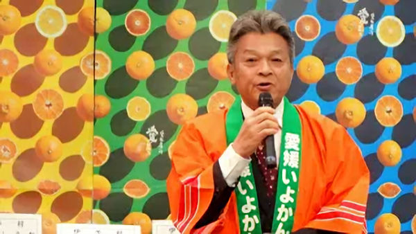 かんきつ王国愛媛を代表する柑橘である『いよかん』を中心に『ポンカン』『デコポン』『甘平』『せとか』『はるみ』と中晩柑も展示されました。ご挨拶では「さすが愛媛のいよかんと言われるよう厳選出荷を進めて参ります。」と市場関係者へアピールされました。