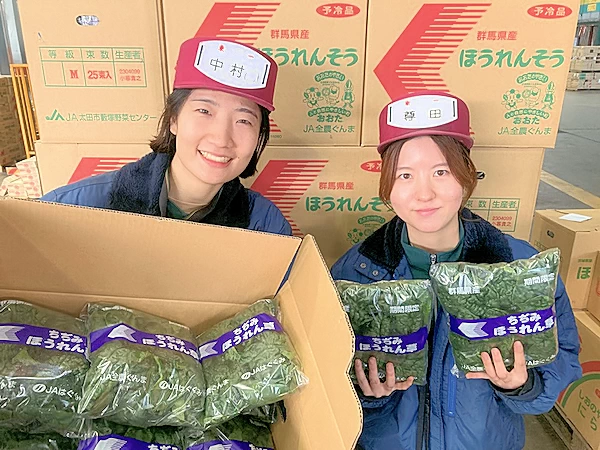 (写真は、『ちぢみほうれん草』を持つ野菜第4事業部 中村と尊田)