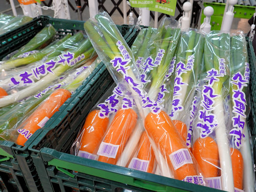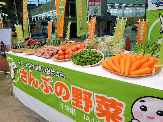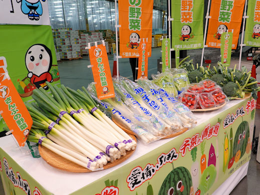 山武郡市産の多彩な青果物が美しく並び、会場を彩りました。展示されているねぎや人参は、これから旬を迎え、最も美味しい時期に入ります。