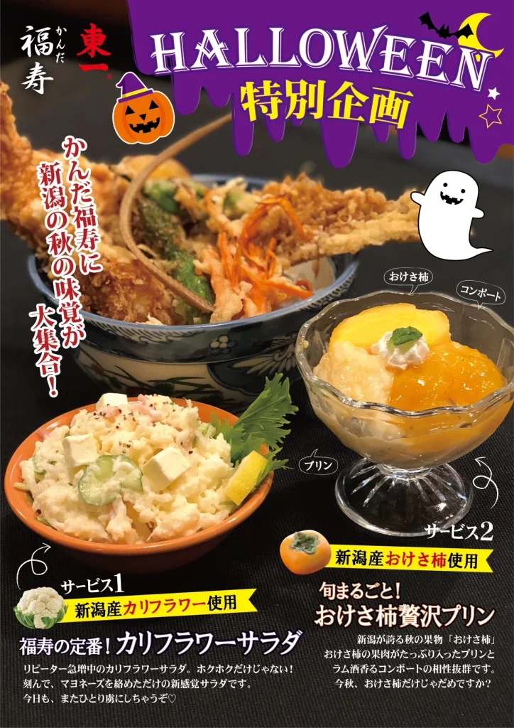 今回は、さらにハロウィンのテイストをプラス、”カリフラワーのサラダ“と新潟産おけさ柿を使った”おけさ柿贅沢プリン“がメニューに登場します!